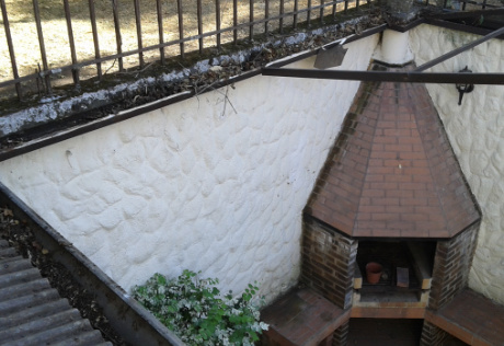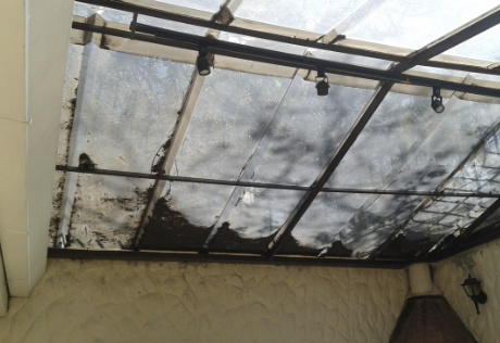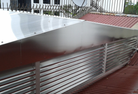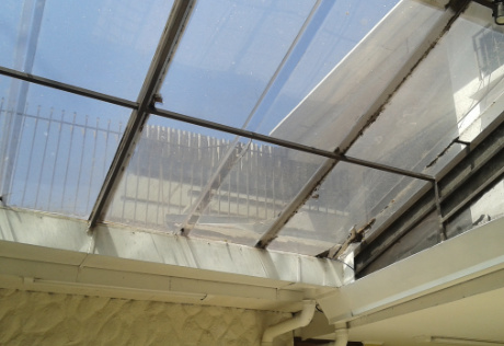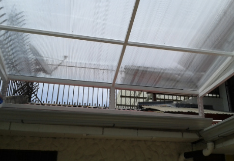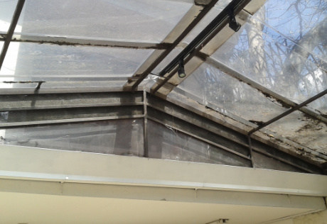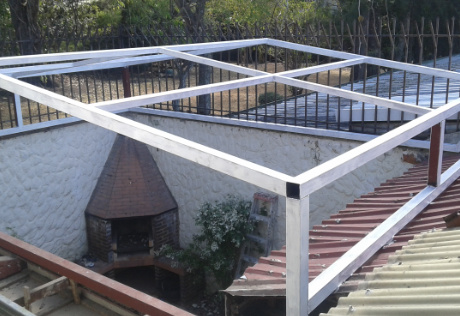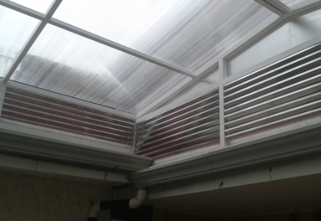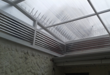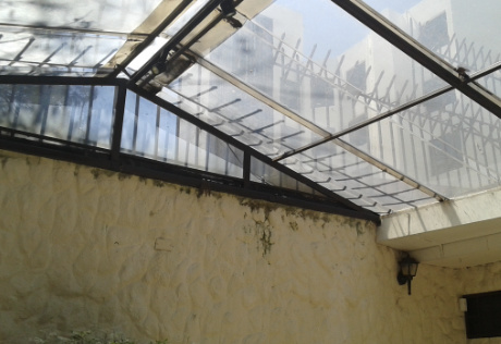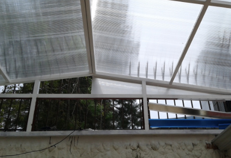 Se desmontó la cubierta y estructura existente para construir una nueva estructura y colocar láminas de policarbonato celular transparente, además de láminas de aluminio tipo celosía, según lo mostrado en la galería de fotos.