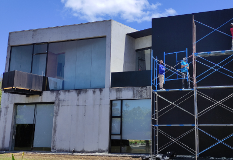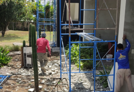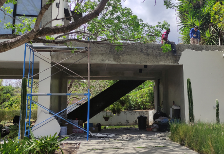 Se retiró el repello deteriorado de todas las paredes exteriores de la vivienda. Luego se aplicó un nuevo repello con acabado fino, seguido de la pintura final, de acuerdo con lo mostrado en la galería de fotos.